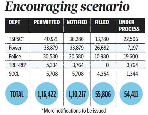 The TRS government has permitted various posts numbering 1,16,422 of which 1,10,217 jobs have already been notified by various recruiting bodies.